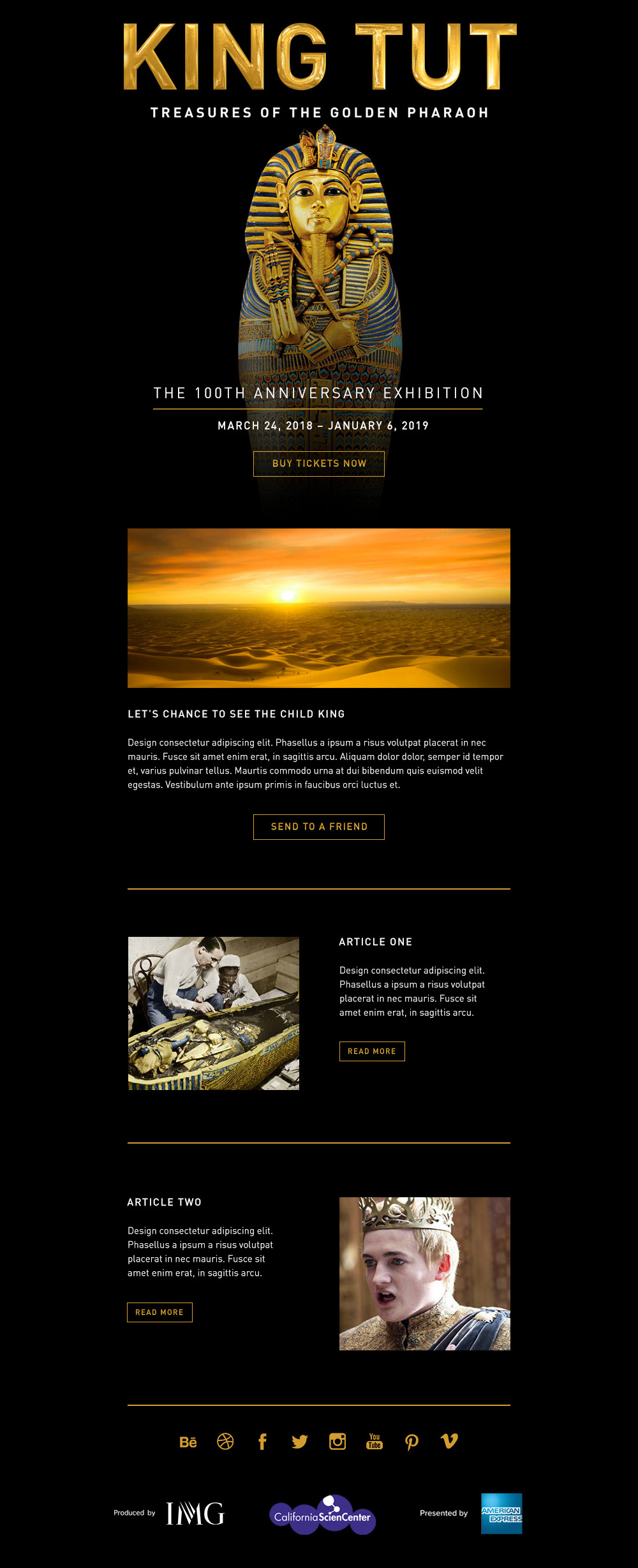 The King Tut Exhibition campaign was the launch of a 10 year around the world tour starting in Los Angeles before moving to Paris and London. In my role as lead designer on this campaign I produced a set of Digital brand Guidelines and a toolkit of social media assets to give to the New York team of junior designers the materials they needed to roll out the L.A launch of the campaign. The toolkit consisted of guidelines and design ideas for creating digital advertising, social posts , video edits. image treatments, email, web design and animations. The launch was a sell out event in L.A and proved very successful on digital platforms with huge engagement numbers. My role continued later working on the Paris campaign where many successful creative elements were repurposed for that event.